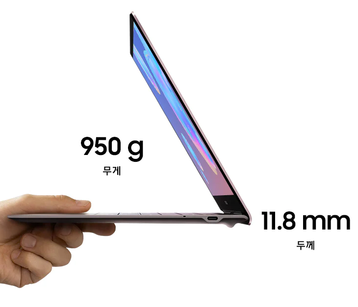 삼성 갤럭시북 s는 11.8 mm의 얇은 두께와 1 kg도 안되는 무게로 휴대하기도 편리한데요.