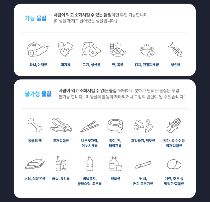 투입이 불가한 물질은 사람이 먹고 소화시킬 수 없는 딱딱한 물질이 불가능합니다.