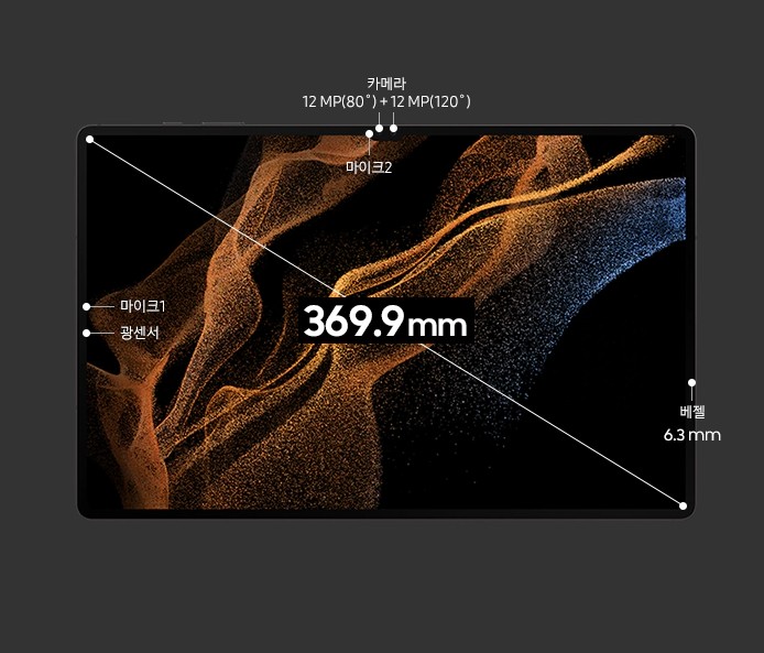 각 테두리의 베젤은 6.33mm로 출시된 태블릿 중 가장 얇게 빠져 시원한 디자인 모습 그대로입니다. 726g의 무게감과 5.5mm 두께의 견고한 내구성의 아머 알루미늄 프레임을 적용해서 떨어뜨리거나 부딪힐 때도 안전하게 지켜주죠.