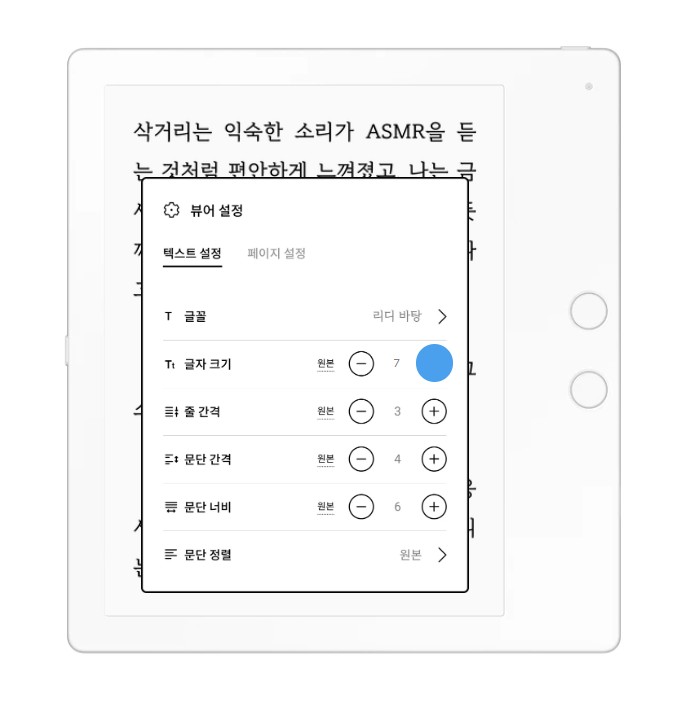 상하, 좌우 어떤 방향으로도 이질감 없이 레이아웃이 구성되어 있고요. 글꼴이라던가 글자 간격 등 뷰어 설정도 가능하니 디지털의 편리함도 적용되어 있습니다.