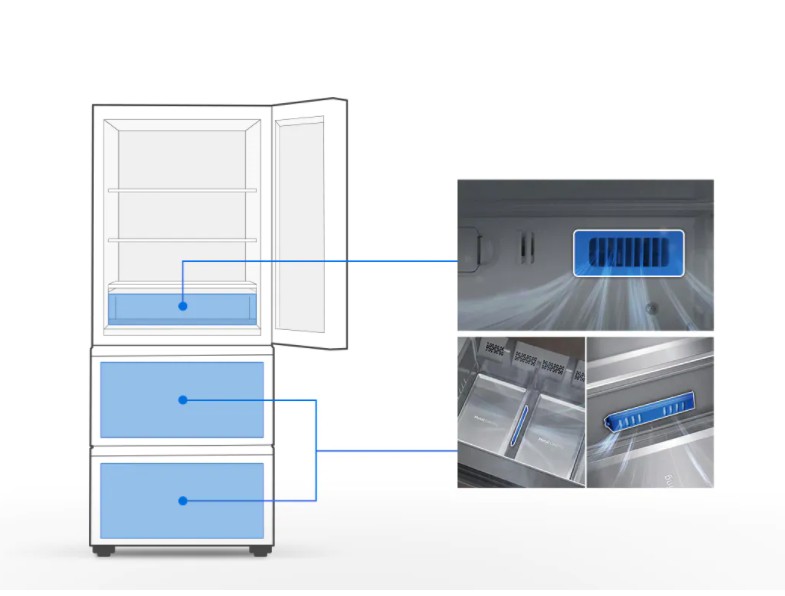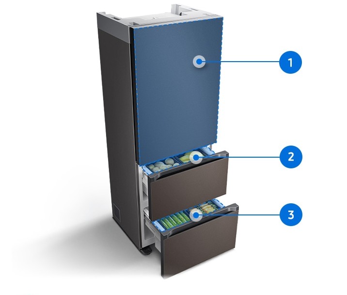 식재료 용도 따라 위/중간/아래 3칸으로 나눈 보관 모드를 설정할 수 있는데요. 칸마다 0.3의 온도 조절을 통해 보관해야 하는 식재료에 맞춘 모드를 통해 신선한 맛을 유지해 주죠. 칸마다 선택 냉각을 할 수 있다 보니 전기료까지 절감할 수 있다는 사실!