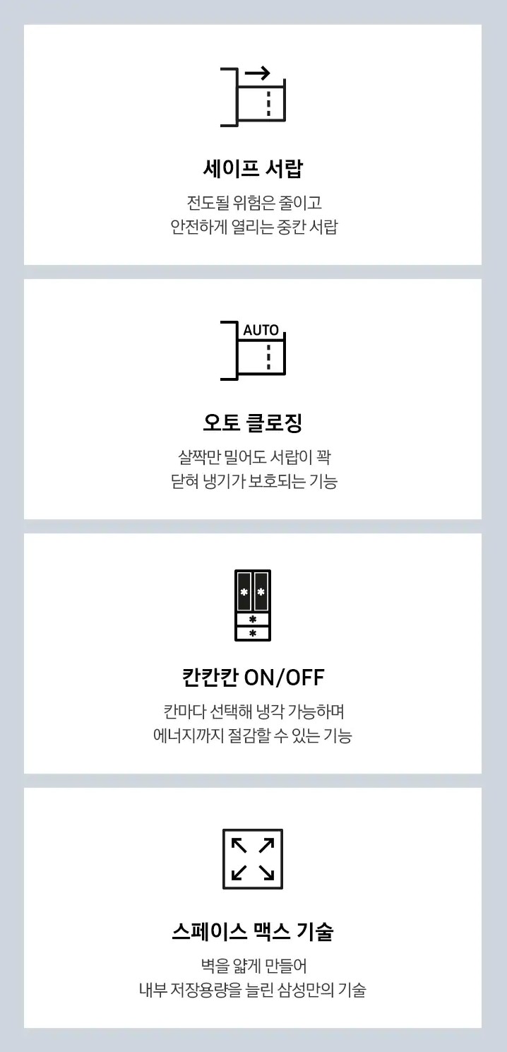 | 개페방식 | 상 : 스윙, 중/하 : 서랍 |
