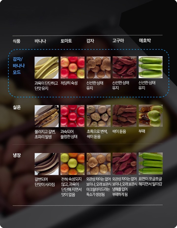 감자나 바나나 등의 뿌리채소, 열대과일은 쉽게 물러 오랫동안 보관하여 먹기가 어려운데요. 이런 까다로운 식재료도 영양소가 파괴되거나 식감이 변할 걱정없이 신선한 상태를 유지해 주는 다양한 모드로 보관이 가능합니다.