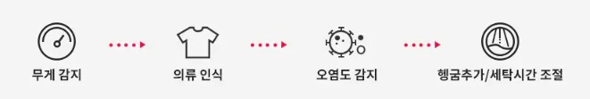 옷감의 무게를 LG 인공지능 기술로 인식 후 6가지인 모션 중 의류에 맞는 모션으로 세탁해 주게 되는데요. 옷감에 손상 없이 탁도 센서로 오염도를 파악해 세탁 시간, 헹굼 횟수를 알아서 설정하여 세탁을 해줍니다.