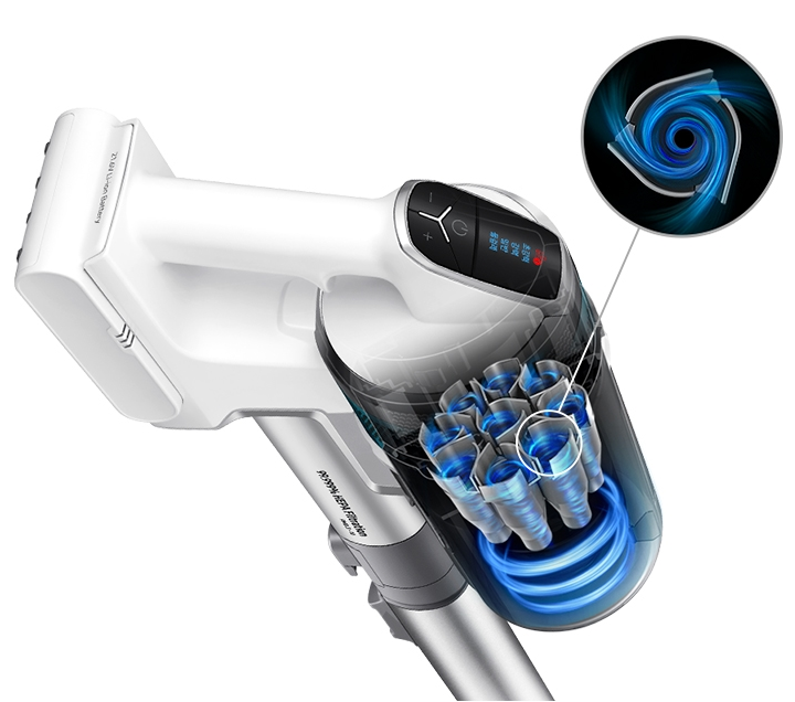 삼성만의 특허 기술, 제트 싸이클론의 27개 에어홀이 공기를 보다 효율적으로 흐르게 하여 최대 150 W 흡입력으로 생활 먼지는 물론, 눈에 보이지 않는 미세먼지까지 강력하게 흡입할 수 있습니다.