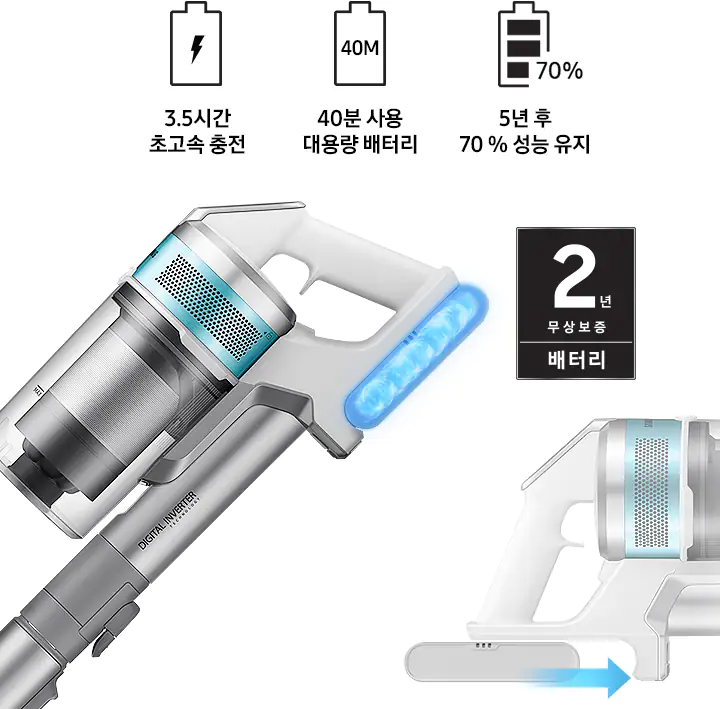 삼성 제트 무선청소기 VS15R8547Q1CW은 착탈식 고출력 대용량 배터리로 최대 40분간 사용 가능합니다. 3.5시간 만에 초고속 충전 가능하고, 수명도 길어 5년 후에도 무리 없이 사용할 수 있습니다.