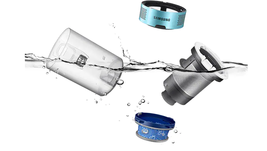 버튼만 누르면 먼지통이 쉽게 분리되어 먼지 날림 걱정 없이 먼지를 비울 수 있습니다. 먼지통과 싸이클론, 모터 필터, 고성능 필터도 간단히 분리하여 물세척이 가능해 먼지통 전체를 위생적으로 관리할 수 있습니다.