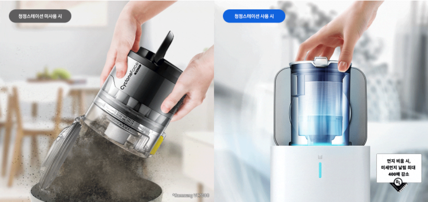 청정스테이션으로 먼지를 비우면 먼지 날림이 최대 400배 줄어들어 더욱 위생적으로 관리할 수 있어요. 청정스테이션만 있으면 간편하게 먼지통의 먼지까지 처리가 가능합니다.
