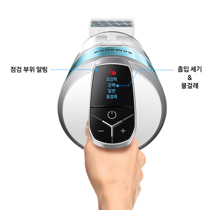 이제 청소기 흡입 세기를 눈으로 확인하고 파워 조작도 엄지손가락으로 간단하게 할 수 있습니다. 청소 도중 청소기에 점검 부위가 발생하면 디스플레이에서 확인할 수 있어 편리하게 사용 가능합니다.
